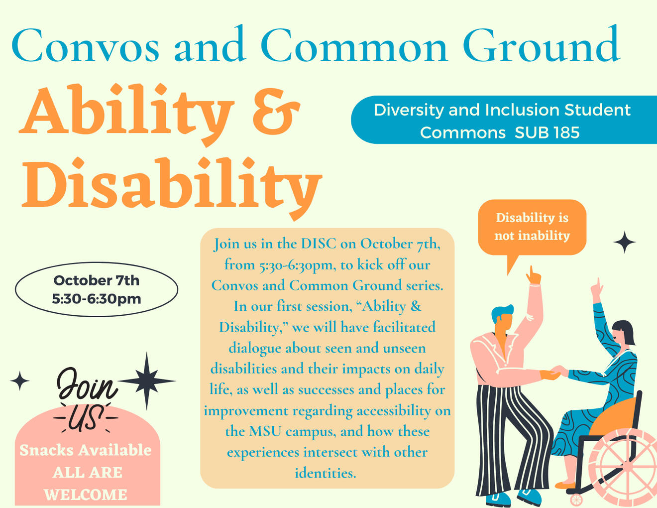 October 7th, from 5:30-6:30pm, in SUB 185From the DISC: "Kick off our Convos and Common Ground series. In our first session, “Ability & Disability,” we will have facilitated dialogue about seen and unseen disabilities and their impacts on daily life, as well as successes and places for improvement regarding accessibility on the MSU campus, and how these experiences intersect with other identities."